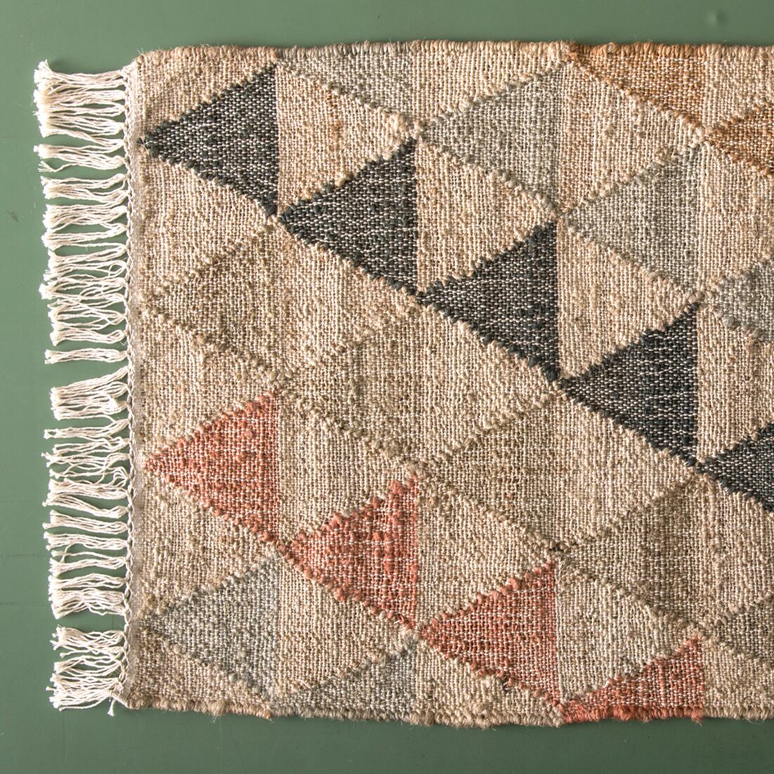 ジュートとコットンを使用したインドキリムラグ。ジュートの通気性とコットンの柔らかさが融合した幾何学模様やトライバルデザインは室内外でご使用いただけます。