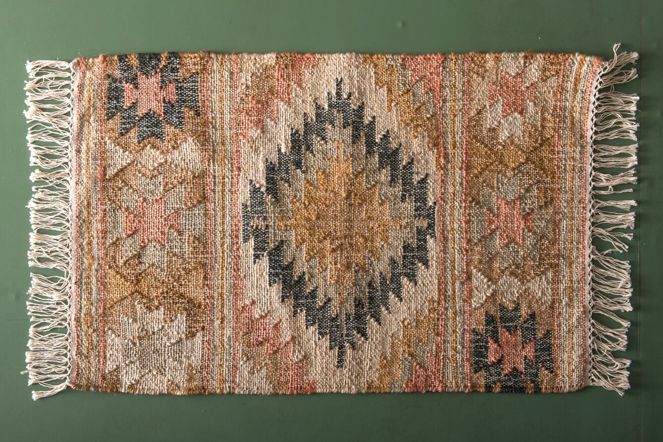ジュートとコットンを使用したインドキリムラグ。ジュートの通気性とコットンの柔らかさが融合した幾何学模様やトライバルデザインは室内外でご使用いただけます。